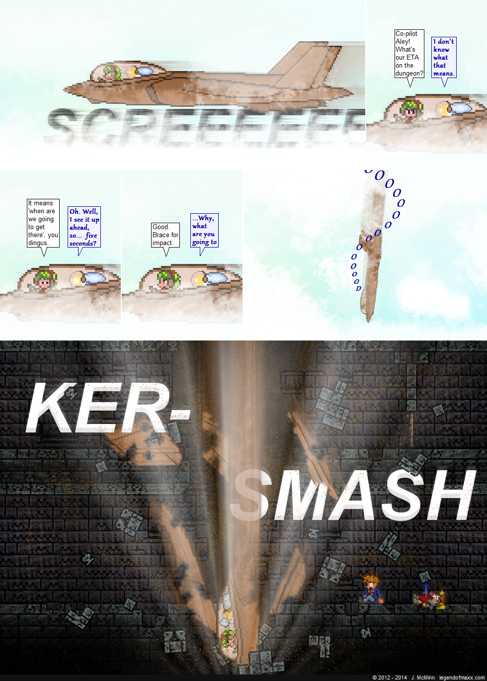 Now I know why this comic took a day longer than usual. It took a while to demolish the Dungeon Brick to make a legit-looking crack in it? Also I find it weird how a beam of pure energy from Aley couldn’t harm a WOODEN DOOR, yet June’s dirt-fighter jet can break through the second-most durable brick in Terraria, obviously a long way down from the surface. But I guess it adds to the quality of unexpected-ness.
