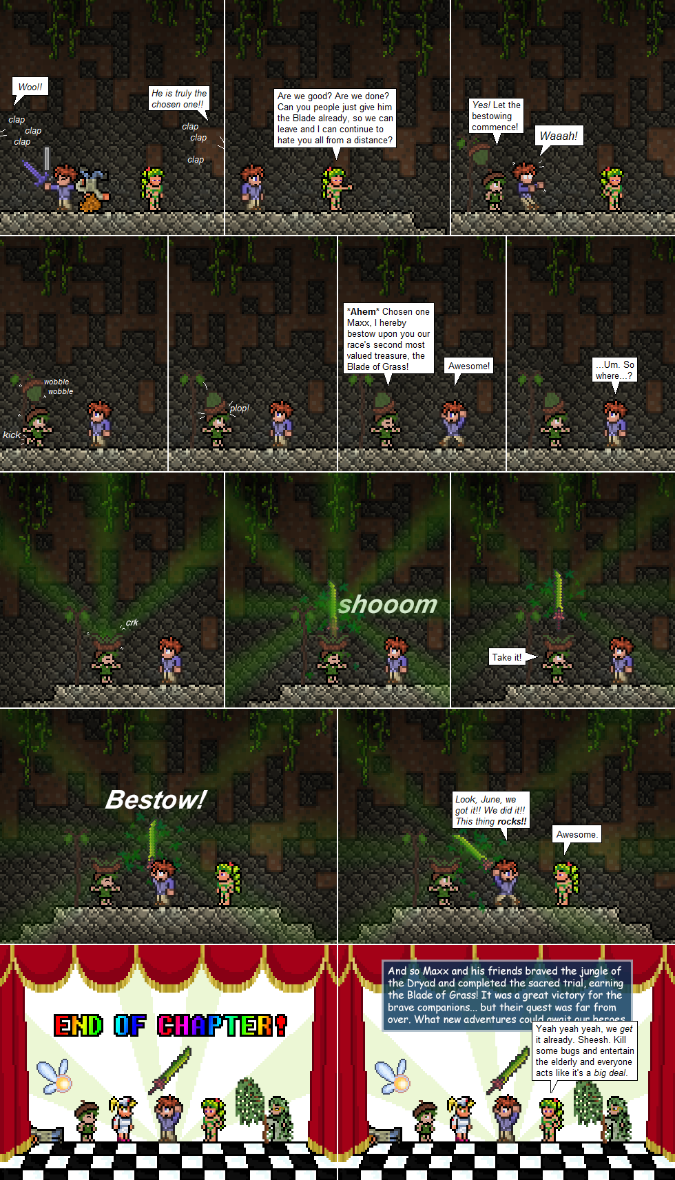 This one took crazy long to make, mostly because of that darn Blade of Grass’s incessant glowing, and the stage at the end. It’s actually a near-exact recreation of the one that inspired it– the stage from Paper Mario– but for some unfathomable reason I decided that I needed to re-draw it in pixelated form. The comic’s ending may seem a little weird to people who aren’t familiar with Paper Mario, but hey. That’s what you get when you read something that my brain cooked up.