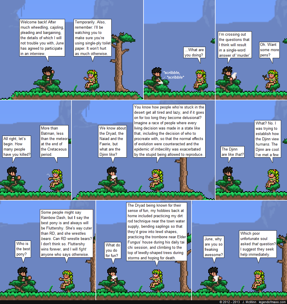 June, have you had any marksman training? What is the maximum number of separate objects you can create and animate with the dirt rod? Have you ever found a temple in the jungle underground? Have you been to the Underworld? How far can you fly on a dirt platform? How high can you fly on a dirt platform? Do the Dyrad have board games? Are you a NPC? How many NPCs have you seen in your life? How many PCs have you seen in your life? Are there any Dryad, Naiad, Faerie, or Djinn PCs? What is the most advance piece of technology you have ever seen? Did you smash it with the Dirt Rod? How long have you had the Dirt Rod? If your a princess then where is the King and or Queen? Do you like bubbles? In the Pygmy Caves why did you only smack Maxx with your hand? Have you been in the Pygmy Caves before? Have you ever played a trading card game? If Dyrads don’t use technology then how did you find out about the ponies? If there have been countless “Chosen Ones” then how come there is still shadow orbs in the corruption, wouldn’t they have all been broken a long time ago? How do you not know where the Naiad are when there is only two directions the Naiad could be in? If you think Maxx has no chance why did you stick around for as long as you did? Have any “Chosen Ones” failed the quest, but didn’t die? How do you know what goes on in a goblin frat party? What is the farthest you have hit any “Chosen One”? Do you like rain? If so what do you like about it? Have you heard the saying Roses are red, violets are purple energy bombs? If you had the space would you expand your personal arsenal? If so then with what? How do you access Hammerspace? What can you store there and how much? Where is Hammerspace? How long has it been since the last “Chosen One”? How often do “Chosen Ones” appear? How much of the world have you explored? What do you do when there isn’t a “Chosen One” around? Who was the most promising “Chosen One” and how far did he or she get? Do you have siblings? What was the strangest shape you got a sapling to grown in? What is the average competency of “Chosen Ones”? Is this enough questions? If not then how many more do you want?