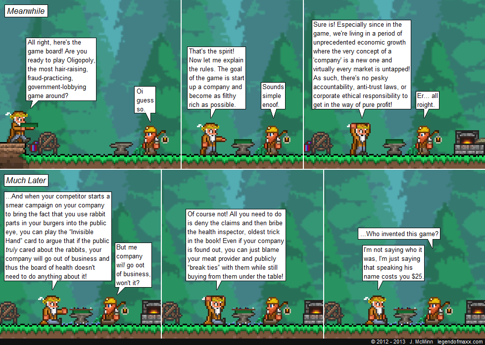 Wait, they have dollars, here? Terraria uses a D&D-esque metals-based currency system that is nevertheless tied to the invisible forces of Communism that keeps a mandatory fiat-enforced price for every commodity no matter how much inflation would be brought about through AFK farming methods. (I have cornered the market in unicorn horns and fairy dust, I’ll have you know!)
