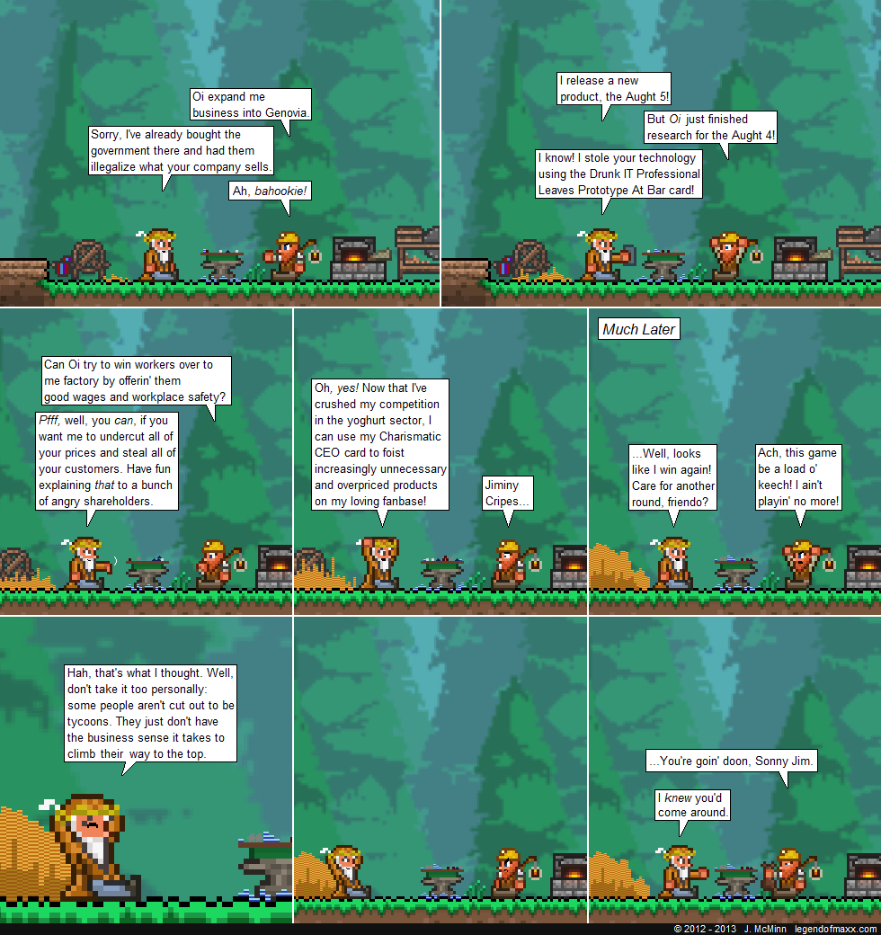 O-k, I realize that I was asking for this a little bit with the comic, but I’d rather keep things from getting too political. Suffice to say that, while I’m not anti-capitalist or anything, I do think that there are issues with the current system (as is inevitably the case with every system), and this is my lighthearted way of poking fun at it.