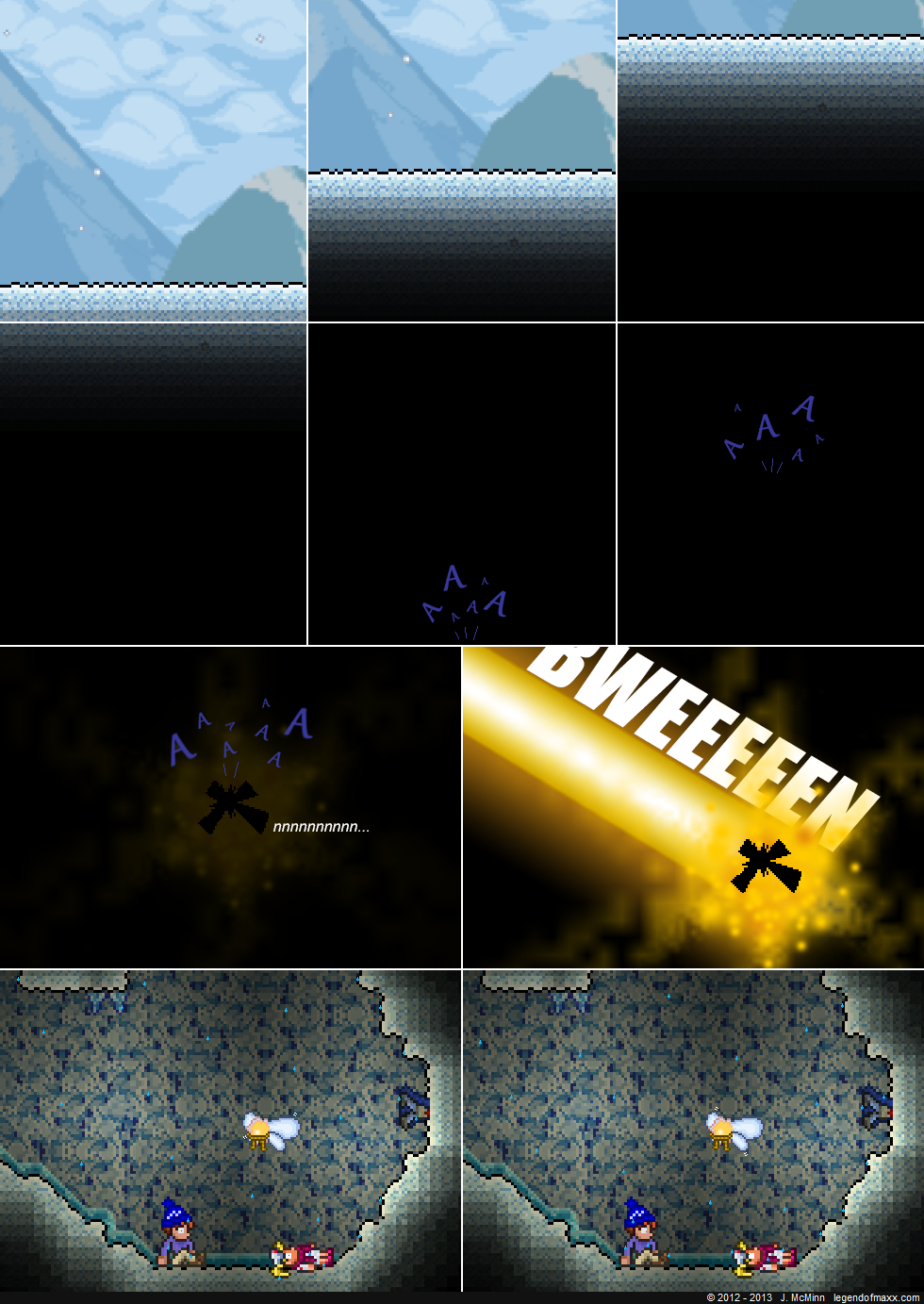 While basing my comic on a game as complex as Terraria does cause some problems– such as with lighting– it is pretty awesome to be able to create a river in-game and not have to worry about drawing the effect myself.