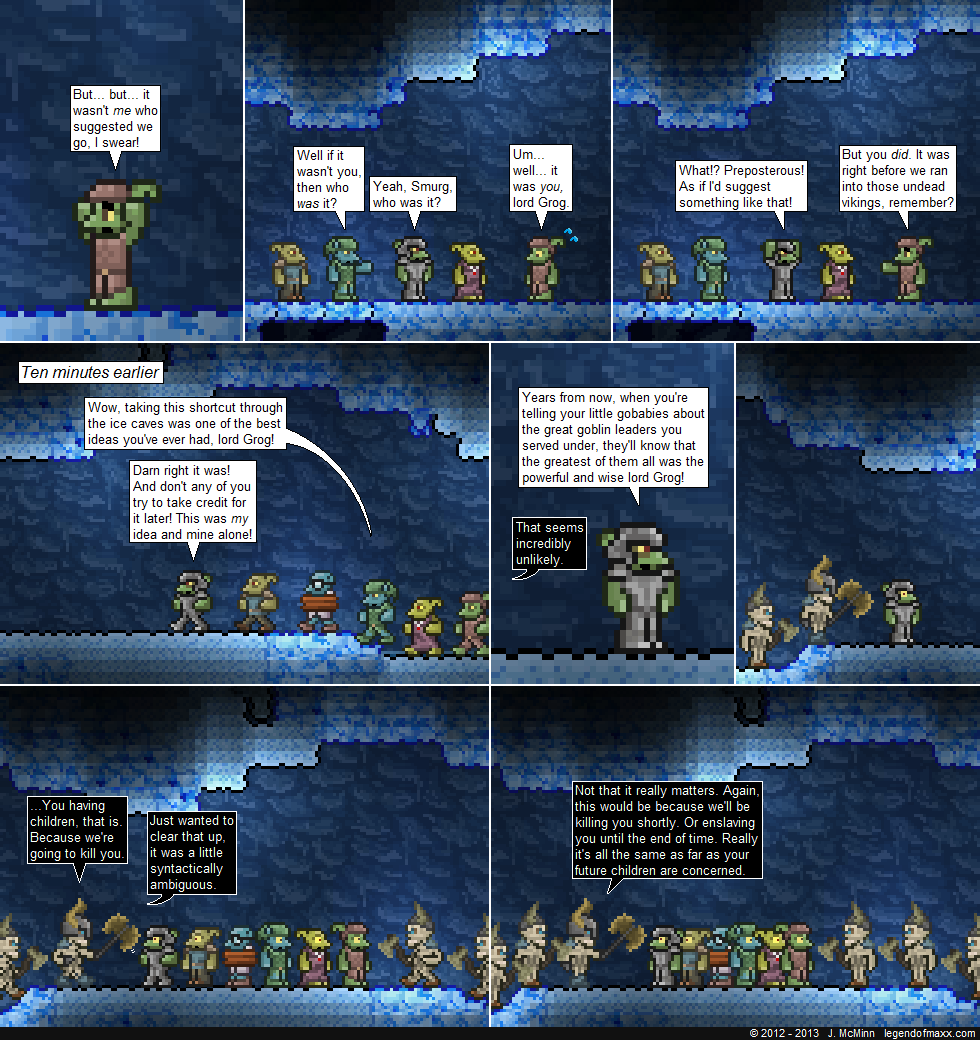 Just realized… I think Jesse just explained why the Tinkerer isn’t with them. Possibly they offered him up in exchange for freedom. Very likely that Maxx and co. will be picking up the Tinkerer in this ice cave. Maxx may of not beaten the Goblin Army yet but there is nothing saying that the comic has to go completely with the rules of Terraria (Heck I don’t it ever has considering that Eye attacked after Maxx used… errr… ate 1 Heart Crystal).