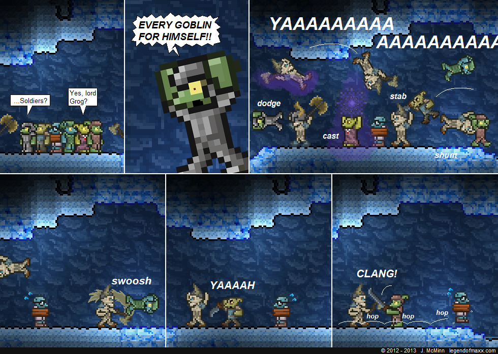 Bleeurrrgh this comic took way longer to make than it should have. Those action scenes really take it out of me. It’s one of the few times that I really regret making the comic with Terraria’s artwork; without the benefit of motion it’s very difficult to represent combat with sprites. Ah well, such is life!