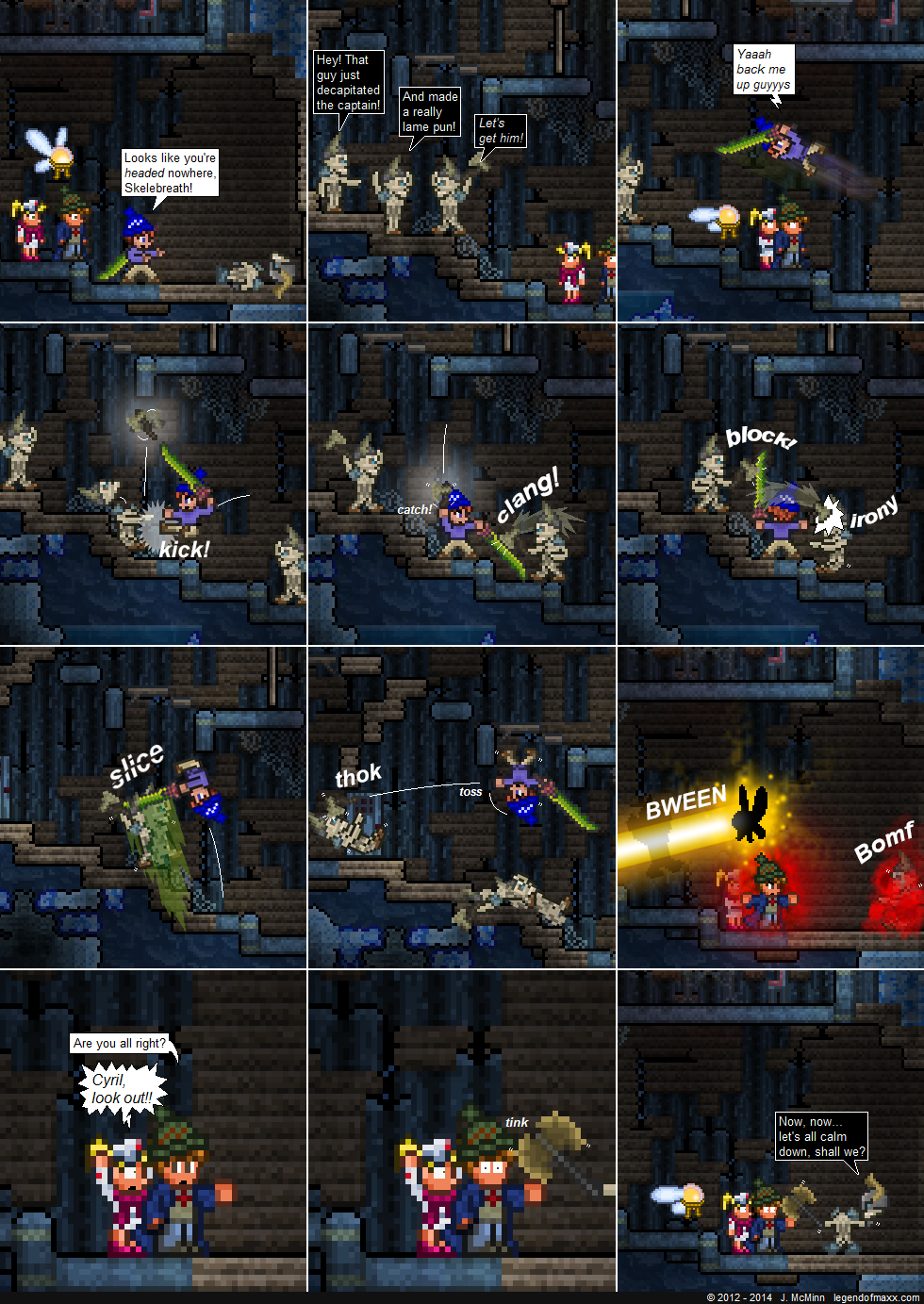 Awesome! a battle of consisting undead vikings against maxx with the legendary blade of grass(and a gravity potion, panel 7&8), mythical ale fairy, a guide with arcane nature’s gift and an NPC that can insta-heal them. well i saw a not balanced battle here but still the fight we’ve wait is here. good post jesse