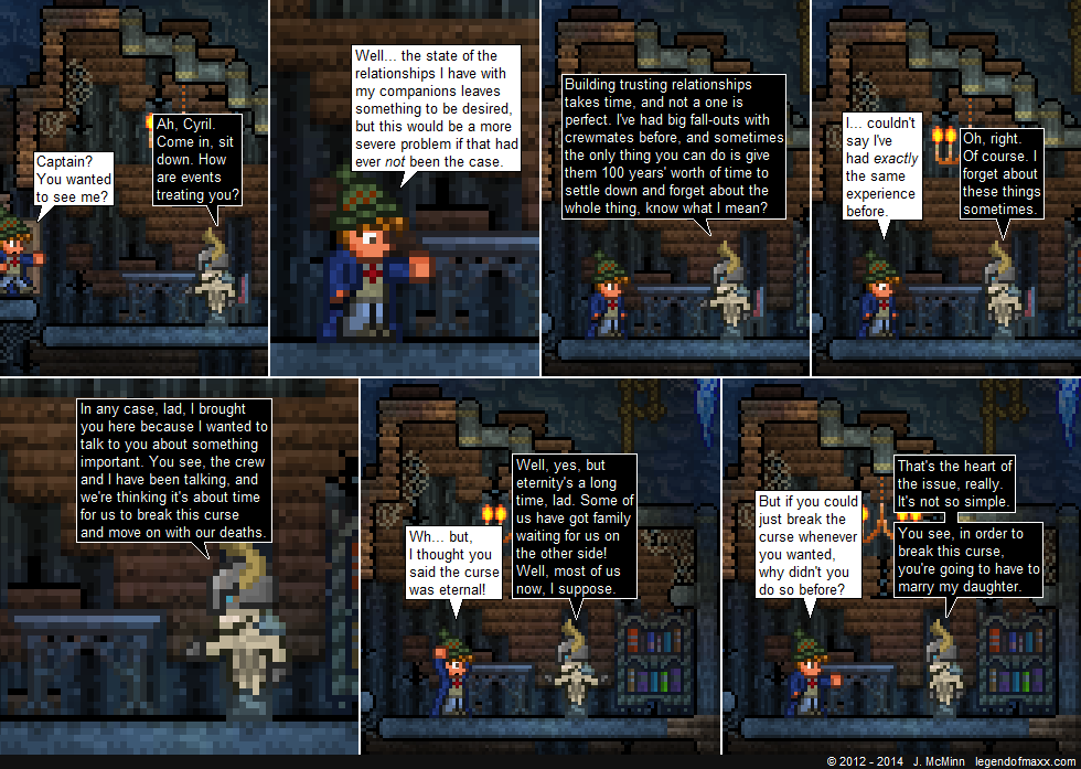 *Ponders who the daughter could be* Either one of the skeletons they’ve been talking to this whole time, or the gold sarcophagus in the treasure room. Would make sense on the latter: After all Cyril’s been in there spending time with her the whoooole time, and he’s soo very fond of ancient treasures, right? =p