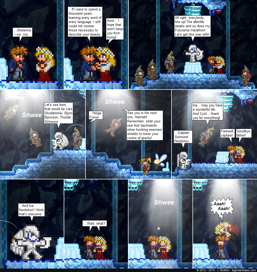 That was too predictable, I understand that Skeletrina is a throw-away character and has fulfilled it’s purpose, yet I really hope you’ll make more out of it, and Cyril won’t just get depressed over losing Ina and then eventually end up with Hannah 🙂