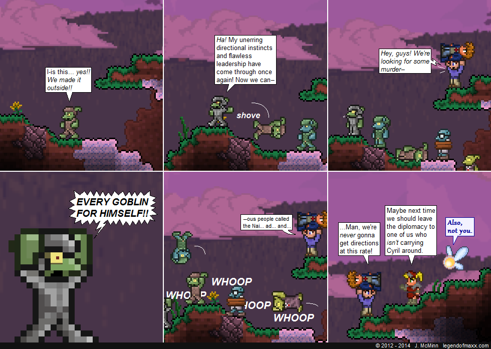 Not for the first time, I’m glad that Terraria has such great lighting and atmospheric effects. How easy that makes it to show that a scene takes place later in the day! Not so great is the fact that I’m away from my normal computer and my fancy Terraria character. The scene this comic takes place in was built using a new character with 140HP and a lead pickaxe.