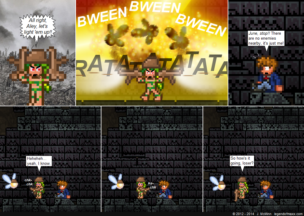 Back on schedule! This comic was originally going to be attached to the previous one, but the jet crashing into the dungeon was too strong of a punchline to have follow-up panels. I could have just scrapped it, but the image of June dual-wielding mp5s had to prevail.