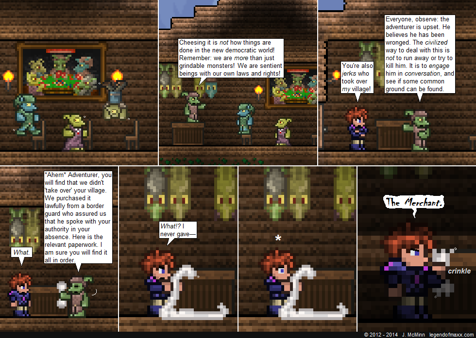 i have an idea. let there be some more goblin moments with Smurg talking to the Goblin Tinkerer. also, Smurg, be angry at the Merchant too, since he didn’t have the right to give you the village in the first place. (still want to see the Old Man/Clothier come into this story at some time)