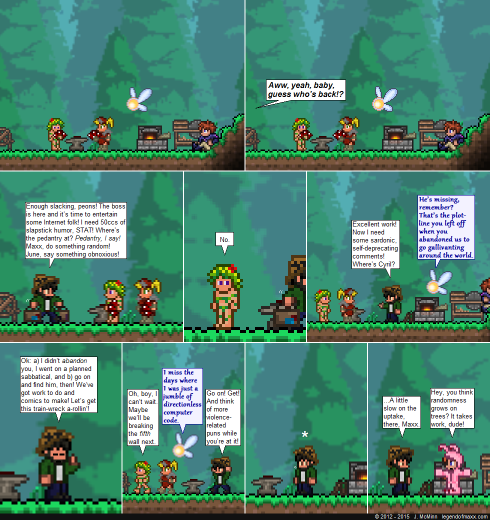 That’s right, folks: Legend of Maxx is officially back in business! Once again you will be able to tune in three times a week for Terraria-related madness. I have returned from my lengthy bout of gallivanting and am excited to get back to comic-making!