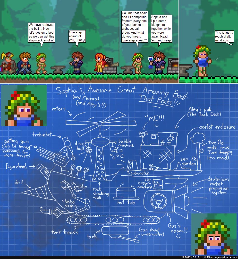 I love it. June’s snark, the buildup in panel 3, and all the creativity in the blueprint. I especially liked how well the stuff in the blueprint fits with Sophia’s character. It was very cute. Great work Jesse!