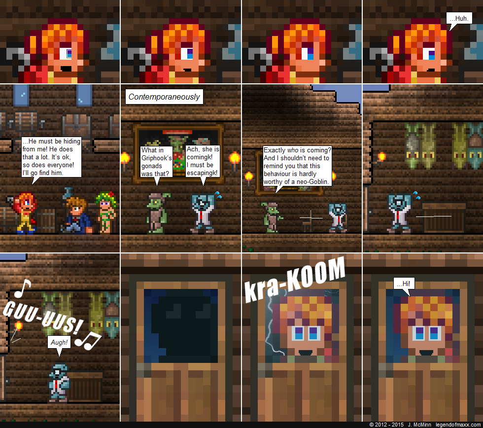 I just discovered this comic yesterday, and I burned through 476 strips in two days. Your interpretation of the scattered terraria lore is really great, and you made me laugh many a time. Good work, and I look forward to more!