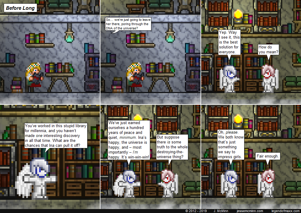 It occurred to me upon finishing this strip just how much this comic’s plot has gotten away from me. Remmy started off as a one-off gag character when Cyril got killed, and now here we are, 500 comics later, with an entire sub revolving around his interactions with what I thought would be another one-off gag character. So it goes.