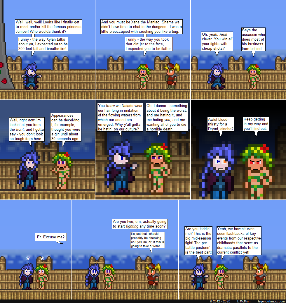 Banter-heavy comics like this one are a double edged sword. On the one hand, they tend to be easy to assemble once I’ve ironed out the script. On the other hand, the amount of time it takes me to do said ironing out is highly variable. This one was surprisingly tricky, since I had to wrestle June and Xane’s dialogue in a direction where Hannah’s interruption would make sense.