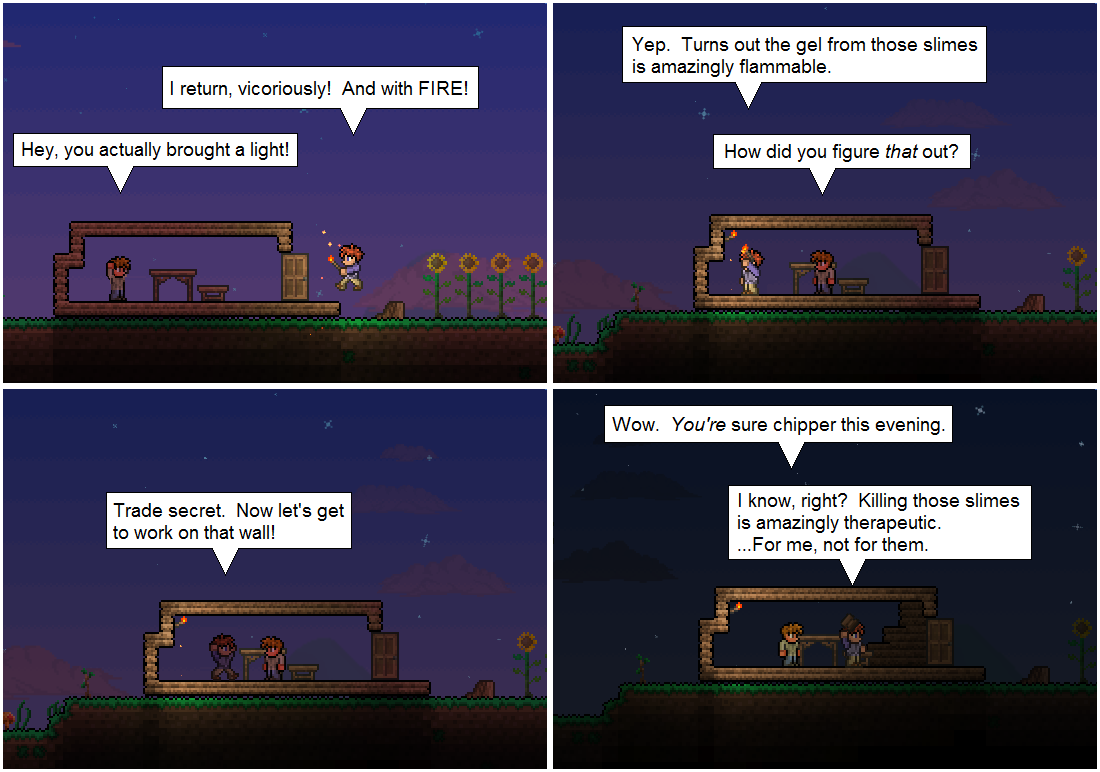 Comic’s up a bit early today. Killing slimes, or pretty much anything in Terraria, IS really therapeutic– there’s nothing quite like the SPLAT sound effect you get when you do.