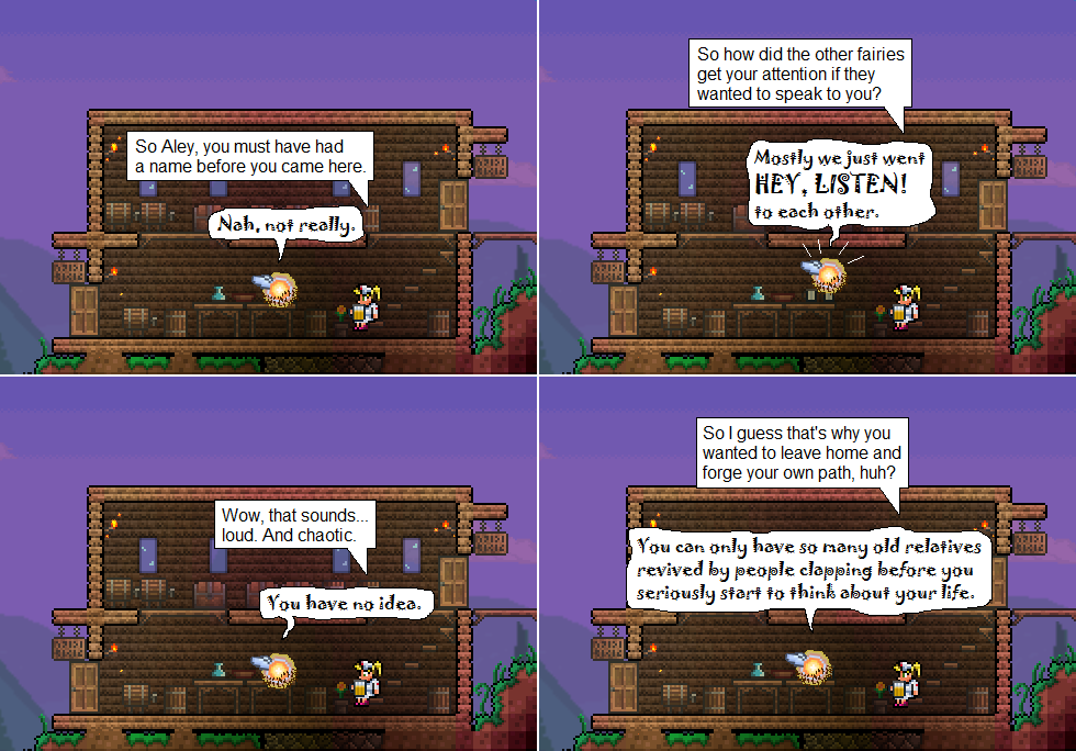 We learn a little more about Aley’s home life. I think that being one of the siblings in a fairy household would be pretty darn hectic. I imagine them having huge families, kind of like bugs or rabbits or something.