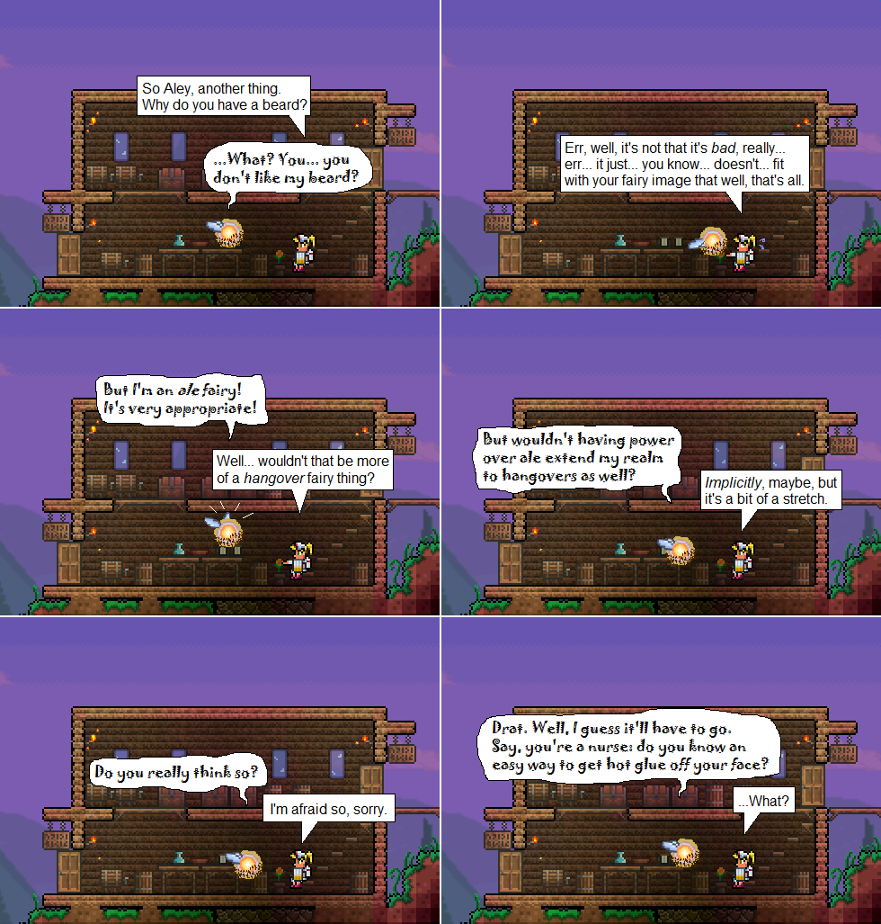 Aww Aley with his sad droopy wings in the second panel. Where did he get the hair from if it’s just glued on? D:
