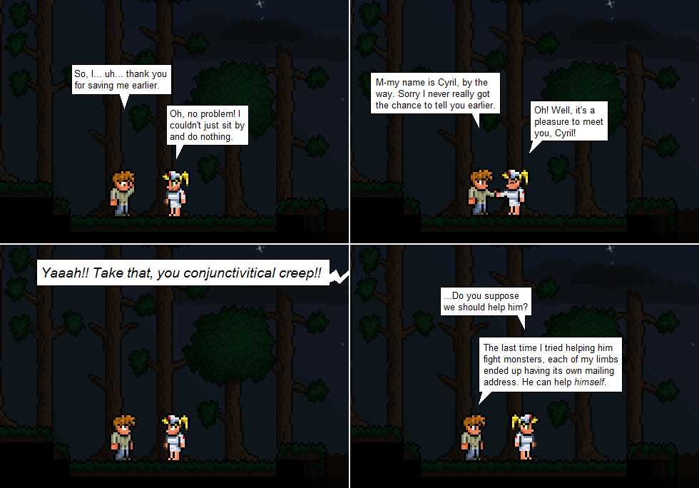 Isn’t… Cyril actually one of the names that your guide can come with? Come to think of it I think the fact his name never was really mentioned kinda makes me think of how NPCs used to have no name in earlier updates of Terraria.