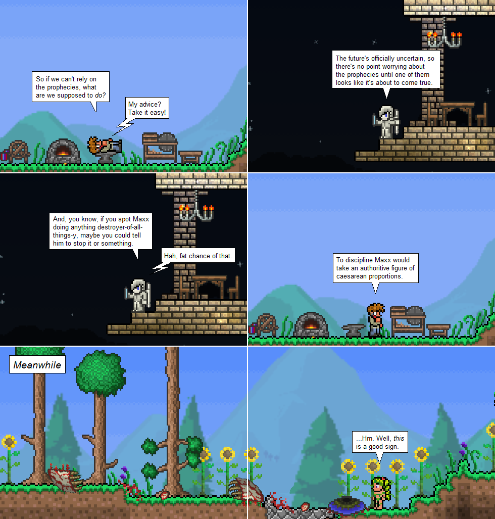 Enter the Dryad! Sometimes I worry about striking a balance between what Terraria fans are expecting and what everyone else is expecting– after all, you guys wouldn’t stop asking about the Dryad because you knew she’d show up, while I have a feeling that non-fans of the game are going to be going ‘huh?’ But don’t worry, all will be explained.