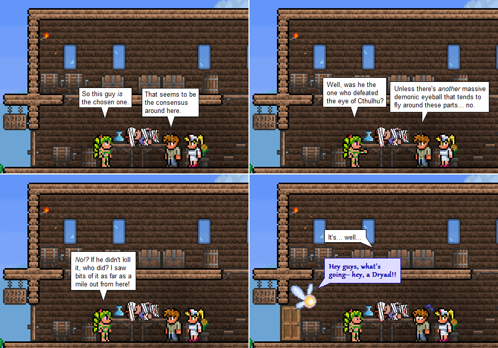 Yeaaah, as much as I’d like to be able to say that I hand-capture each screen separately, if the location is staying the same for the whole comic I’ll use the same image. In fact the method I use to make the comics has changed a lot since when I started; now I capture the environment and the sprites separately. It prevents lighting issues, which are very common in Terraria…