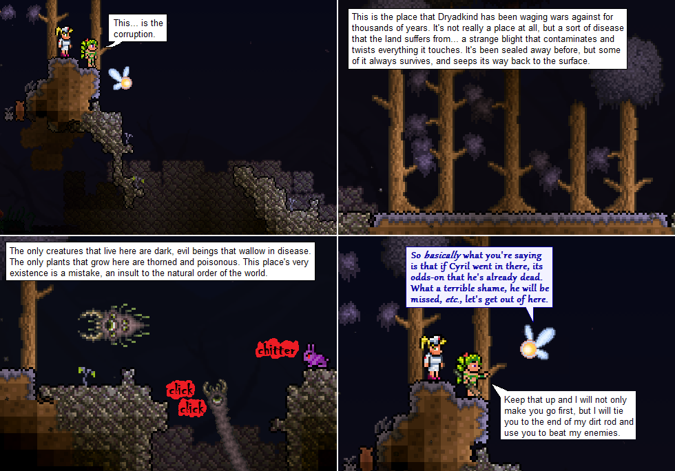 This one’s a little more plot-expositiony… the comic’s going to get like this occasionally, mostly because I plan on adding my own twists to the plot of Terraria as the comic goes on. But I promise you that this won’t become some kind of RPG soap opera!
