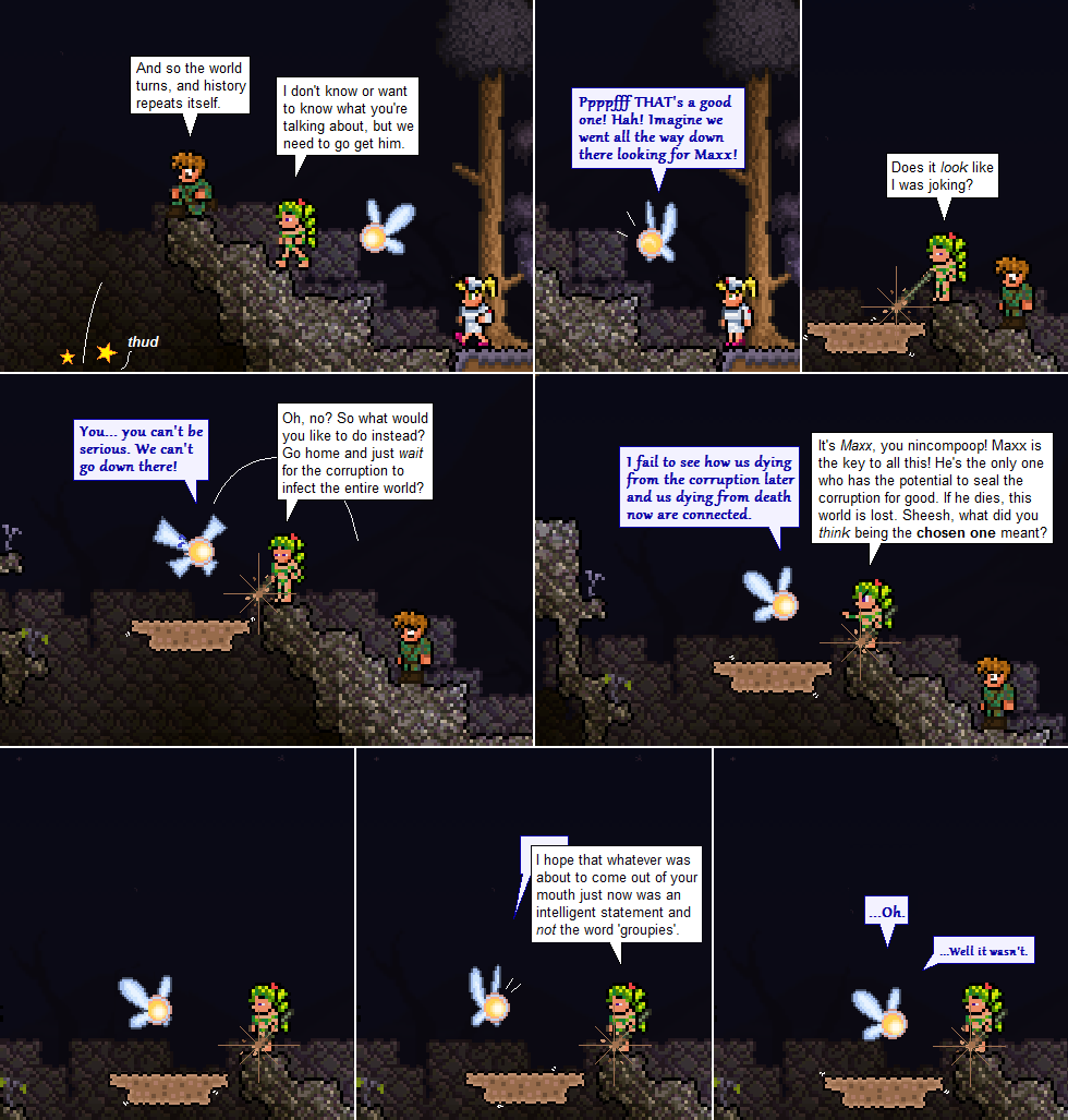 This is for Jesse these comics our interesting and amazingly funny but it seems to be to focused on the story so i would appreciate it if you took a break just to throw some one-liners in for something (also the archive is kinda useless in my opinion because you have to remember what comic you were on instead of names)