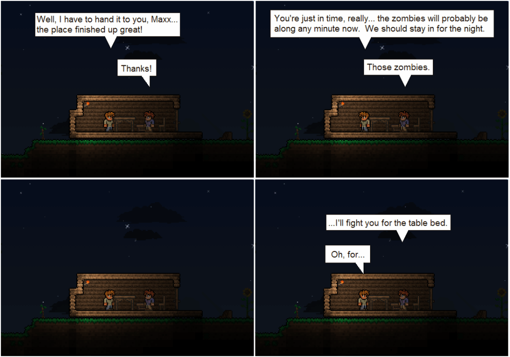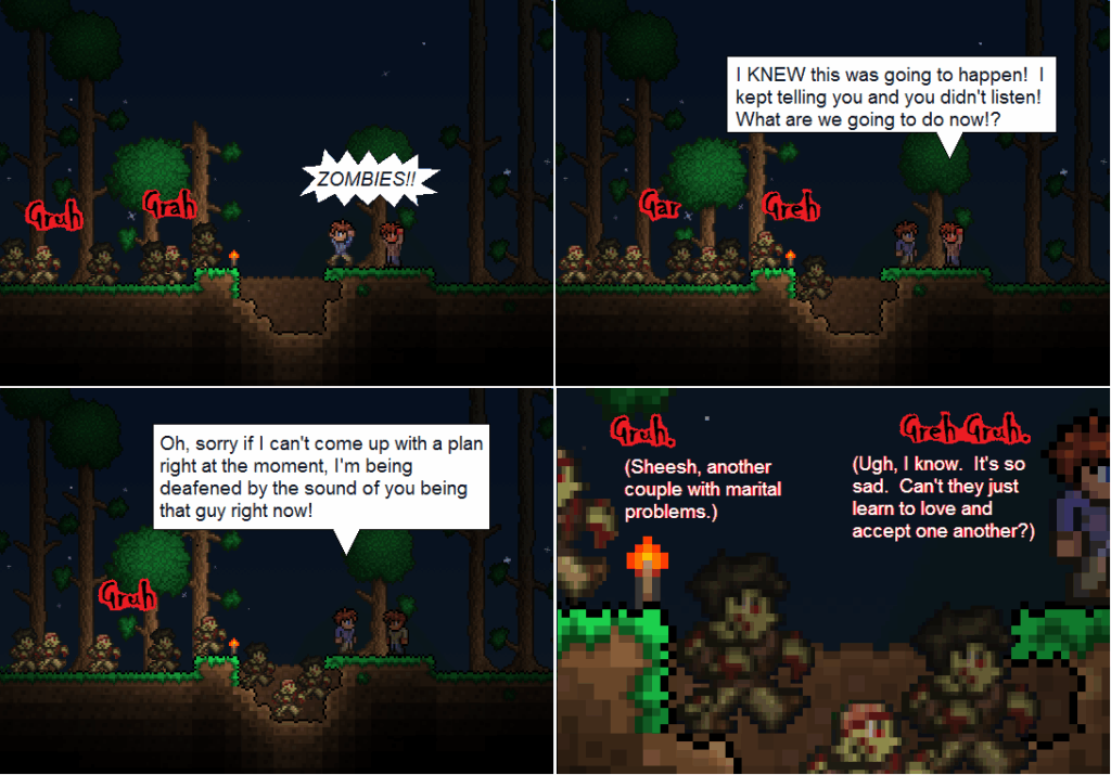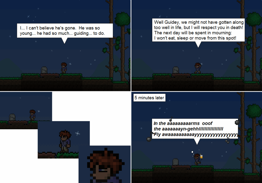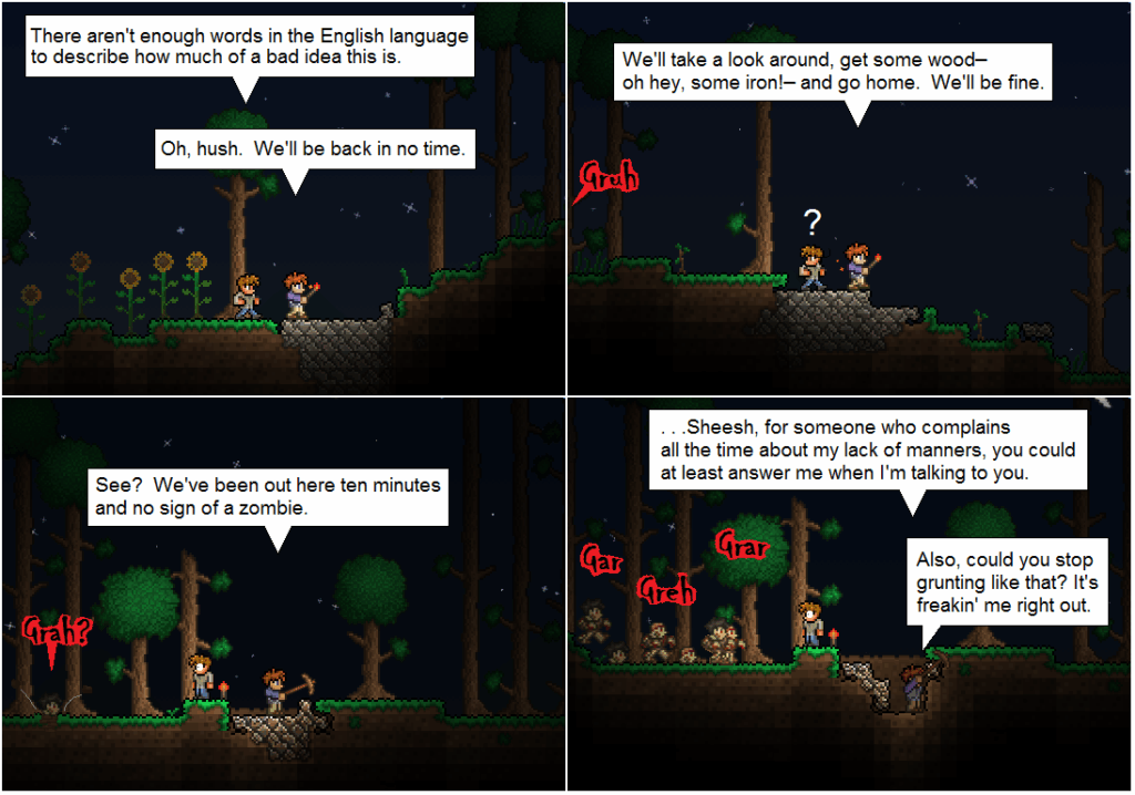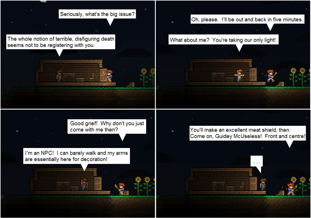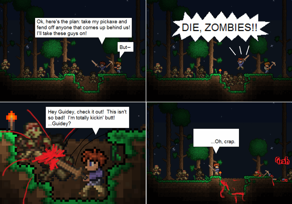 Sorry for the late comic tonight– I was playing Skyrim. I like how this one turned out! Apparently Guide likes